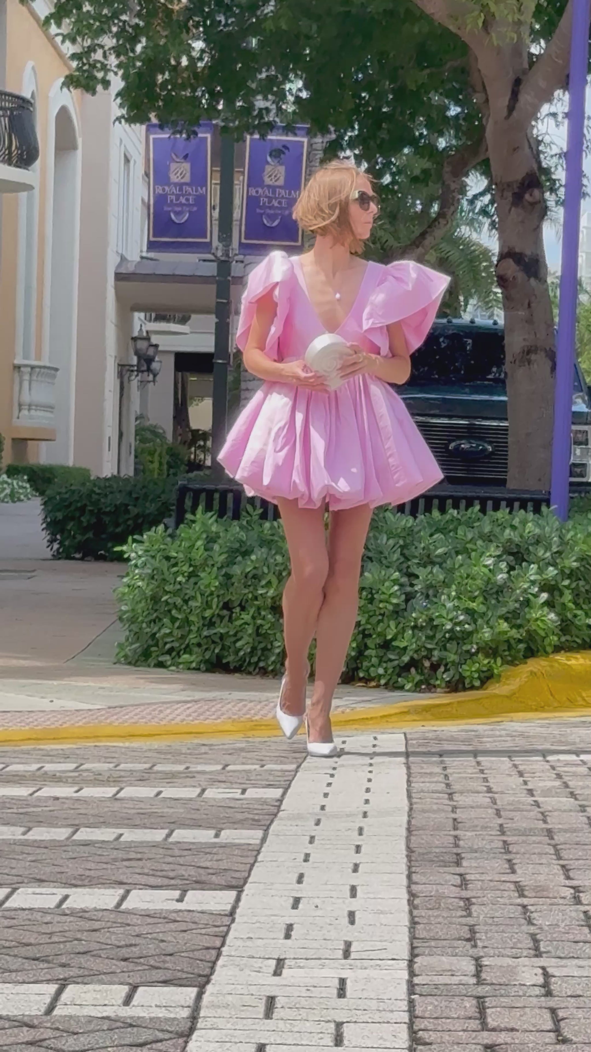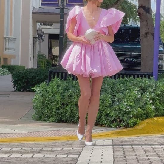 The dress in the image is a playful yet elegant mini dress in a glossy, bubblegum pink fabric with a slight sheen. It features exaggerated, sculpted shoulders that create a dramatic silhouette.