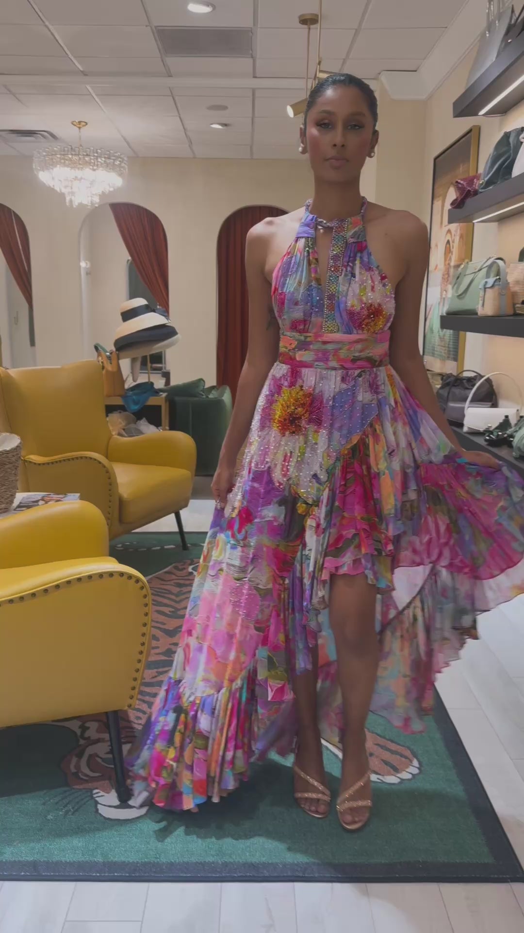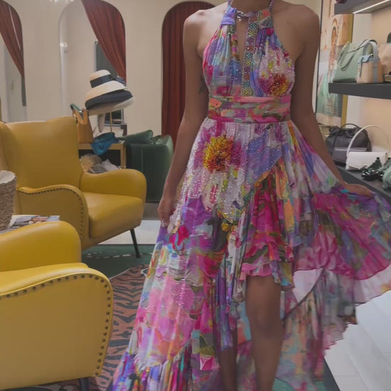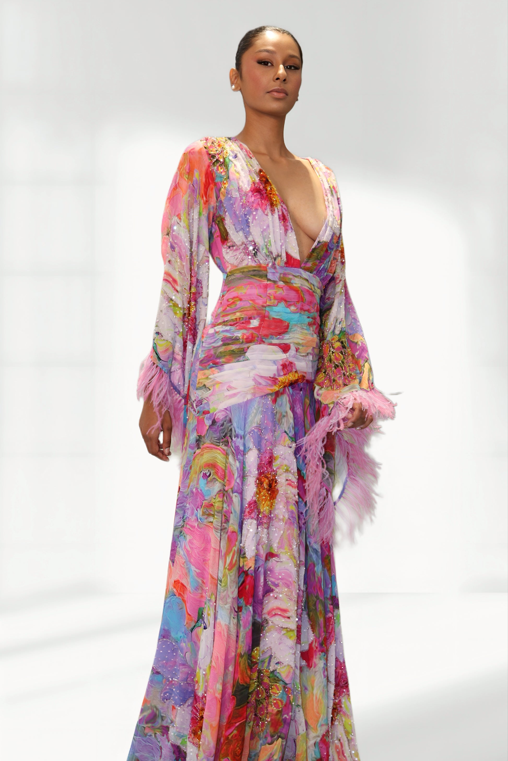 A striking long-sleeve dress in a vibrant, artistic print, defined by its flattering cinched waist and spectacular flared cuffs.